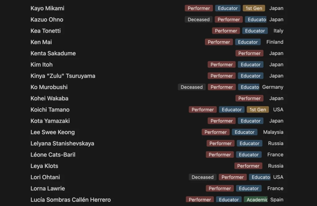 Butoh artists are mapped based on their training lineages, with each artist color-coded according to the country they are based in. For now, only optimized for desktop or tablet.